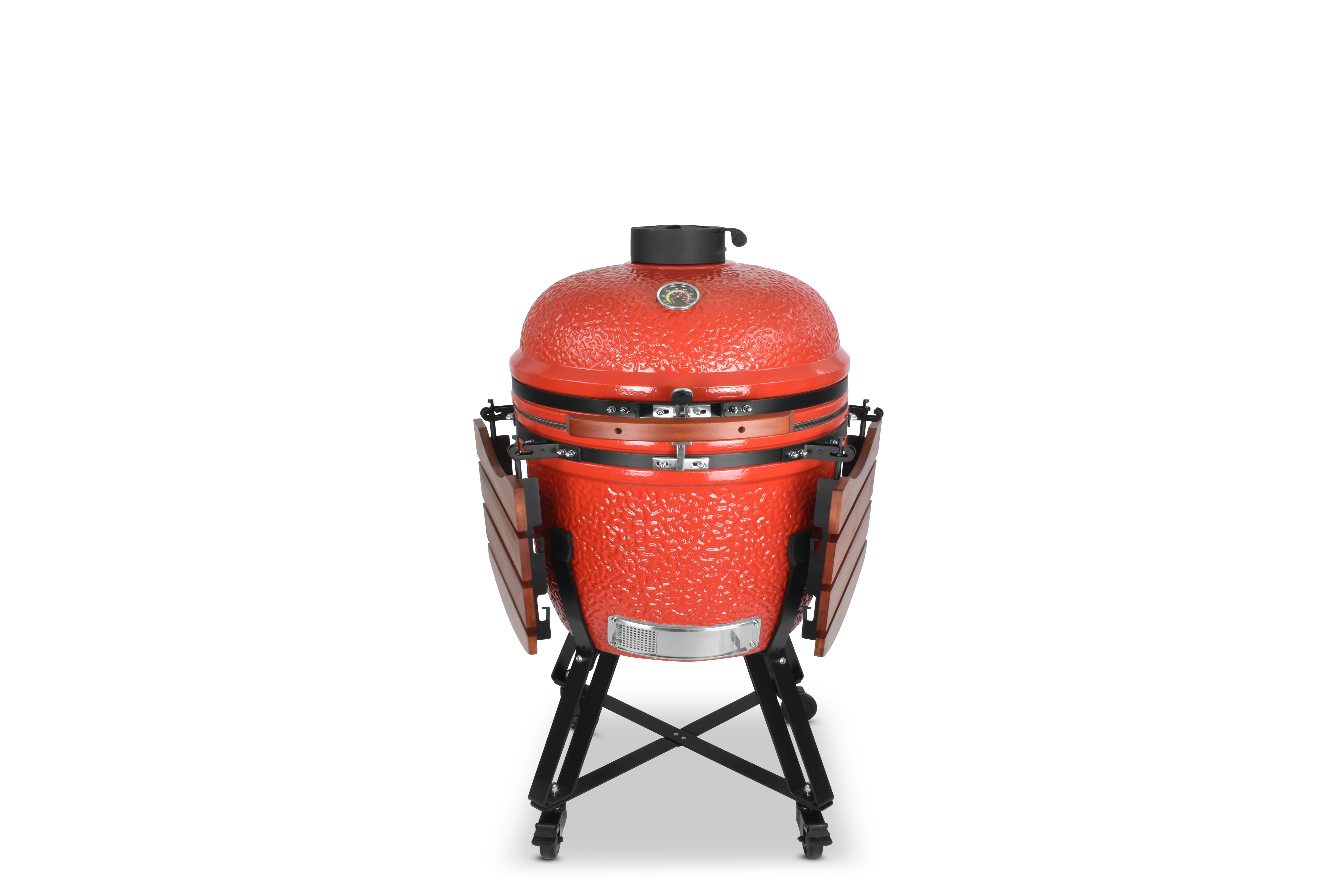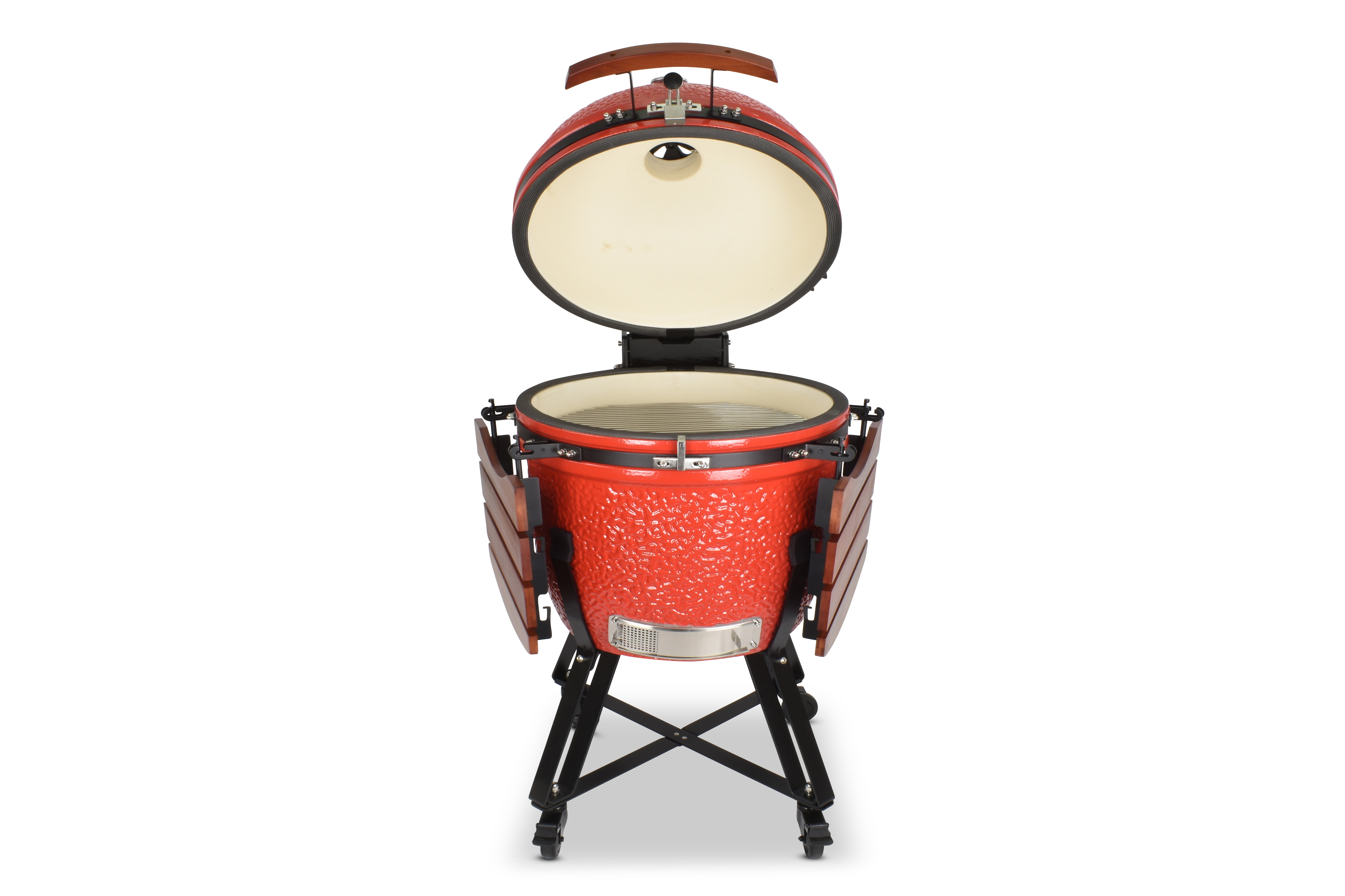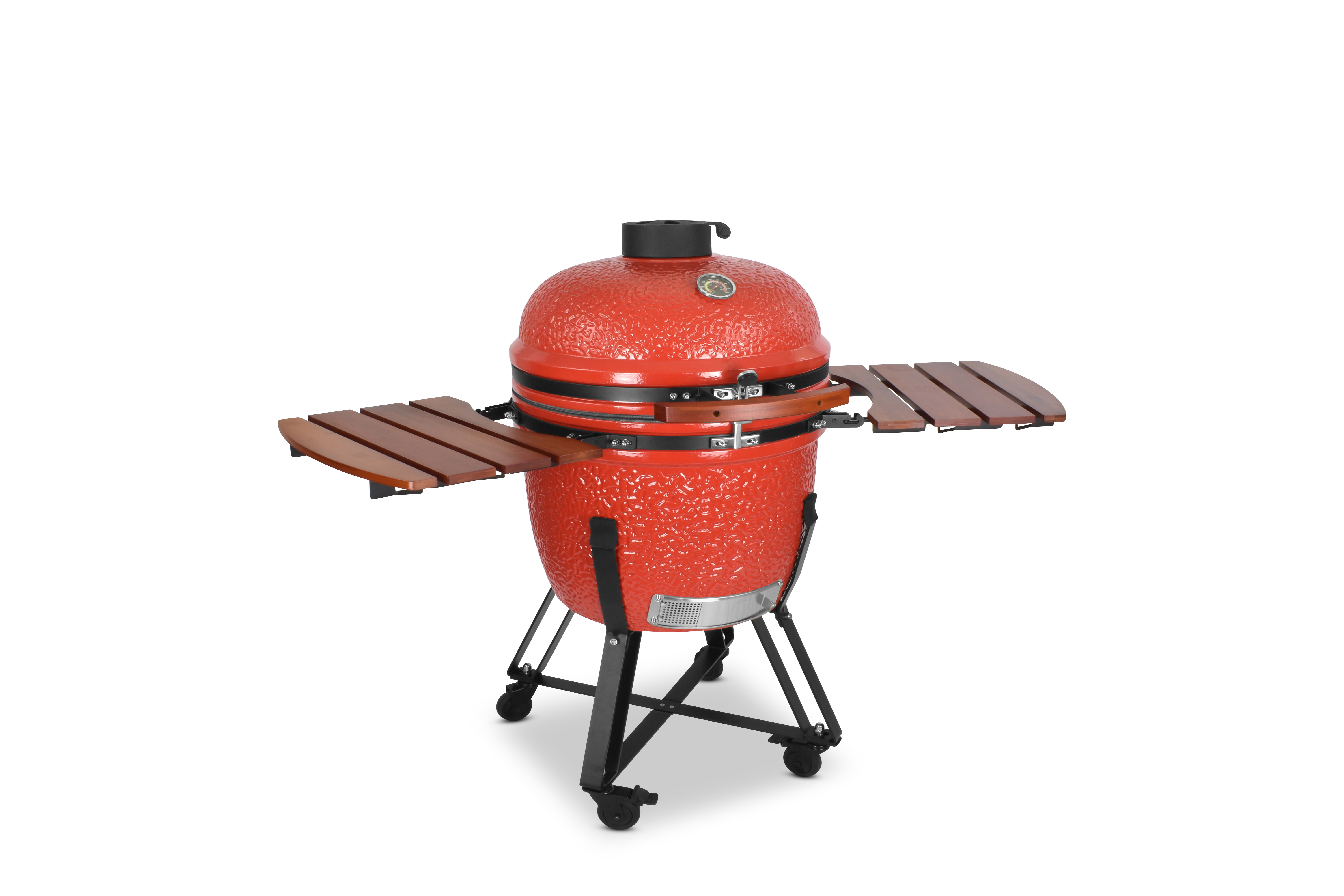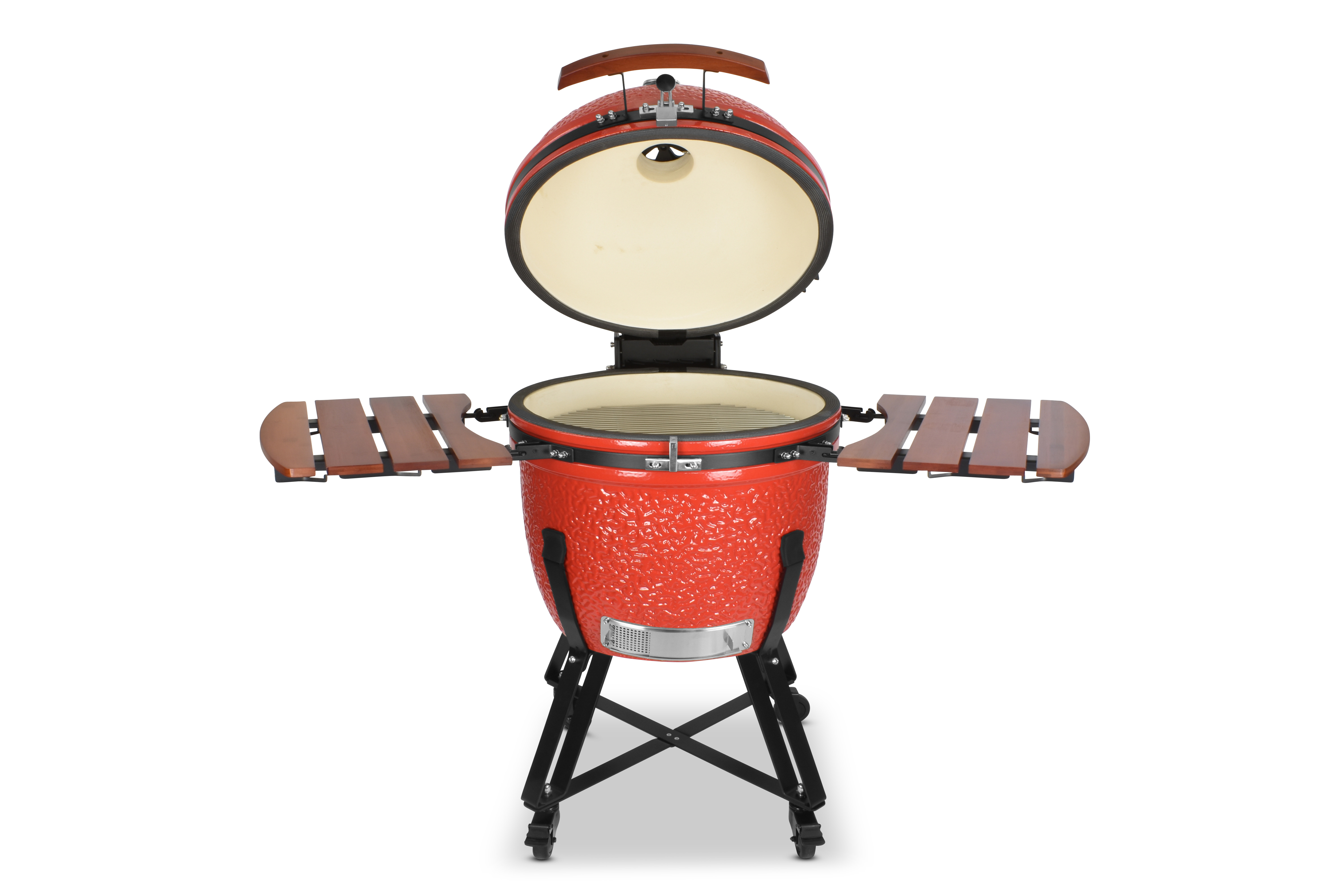 Damit es Ihnen an nichts fehlt, wird der Grill mit einem umfangreichen Zubehörpaket geliefert: Zwei einklappbare Ablagen aus Bambusholz links und rechts neben dem Grilldom bieten genügend Ablagefläche, damit sie immer wissen, wo Grillgut, Besteck oder Getränk ihren Platz finden. Sein Gestell bietet dem Kamado nicht nur einen sicheren Stand und hebt ihn in eine angenehme Arbeitshöhe, sondern ist auch mit vier Schwerlastrollen ausgestattet, um ihn mit wenig Mühe zu bewegen. Damit beim Grillen nichts rollt, besitzen zwei der Räder Feststellbremsen.