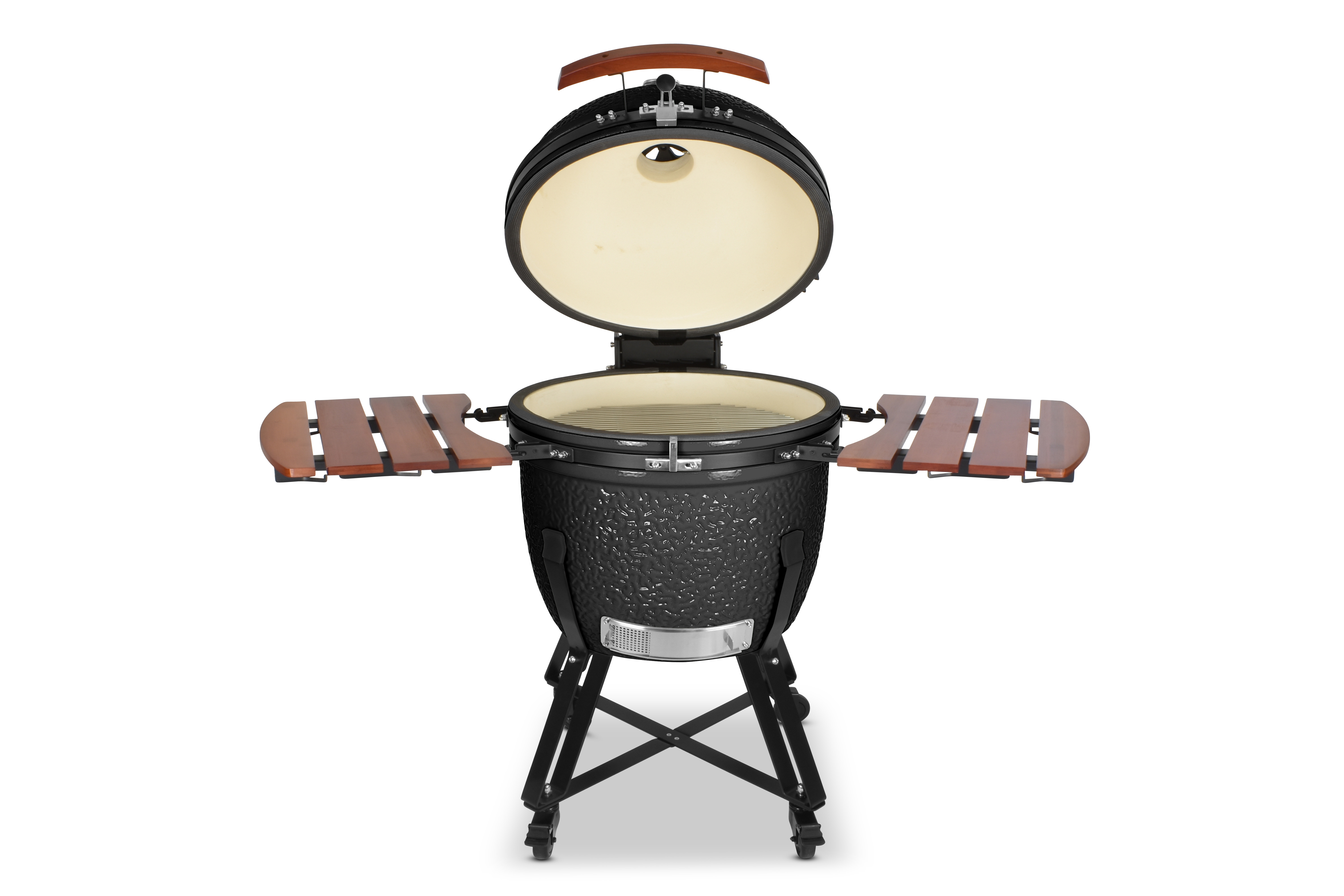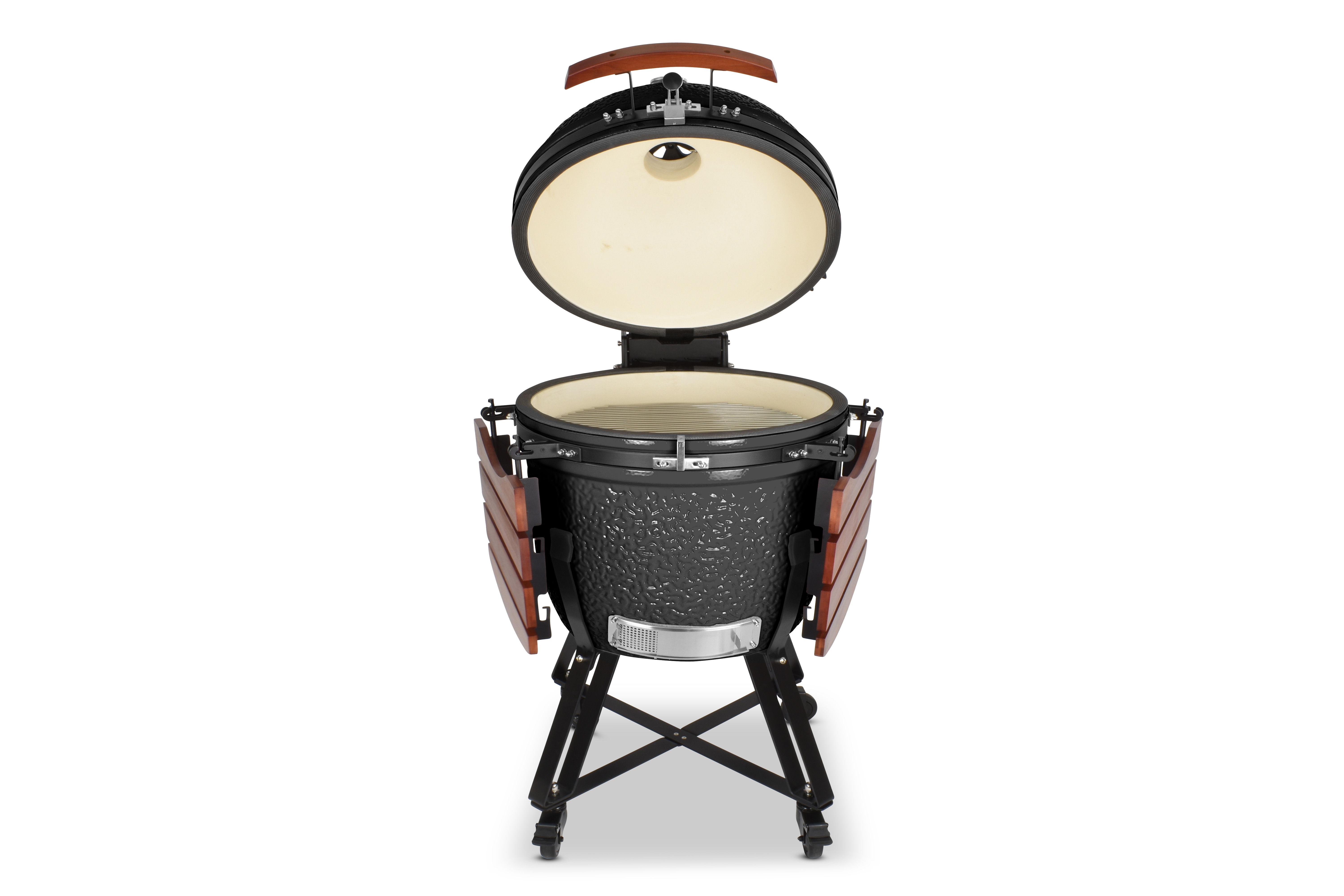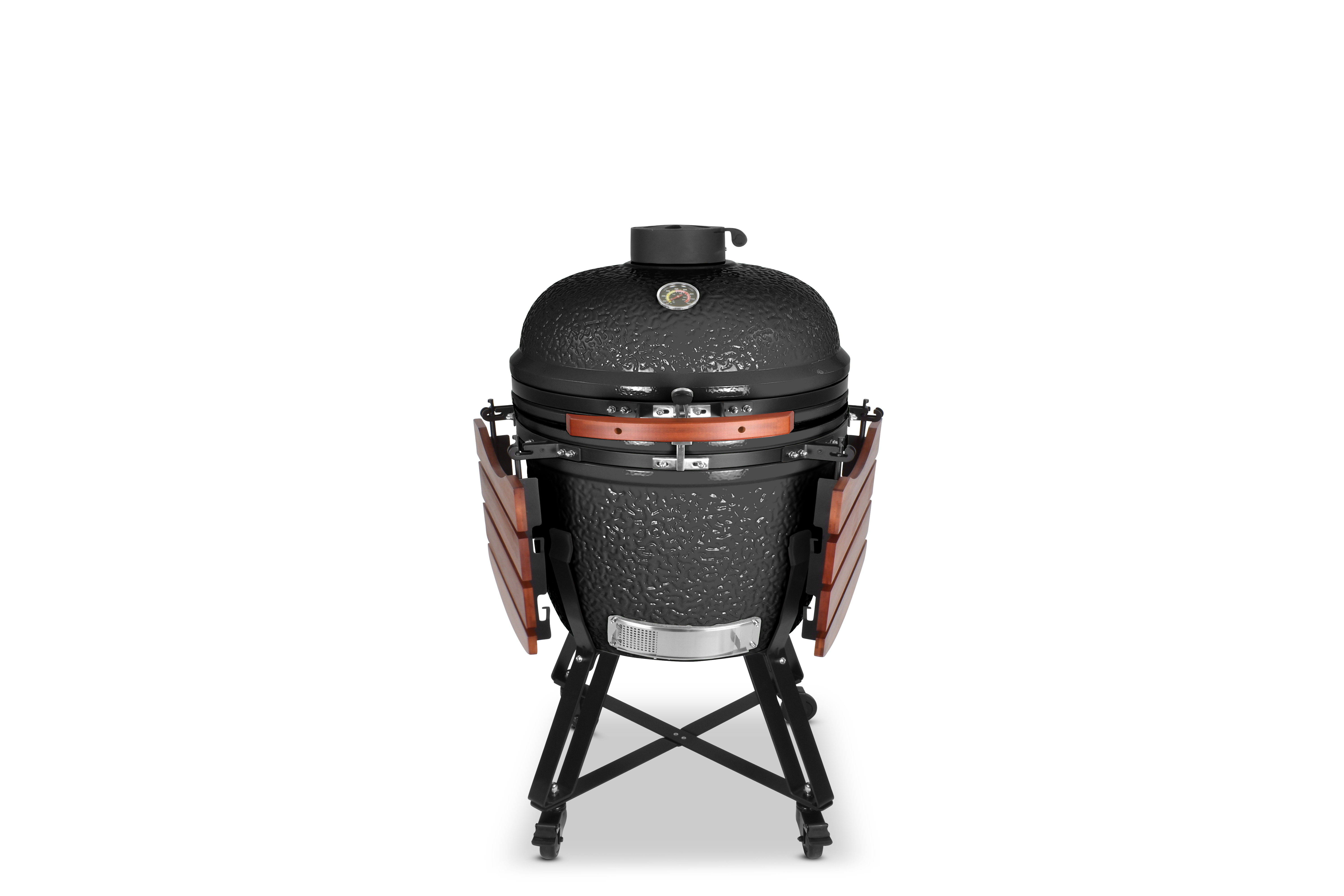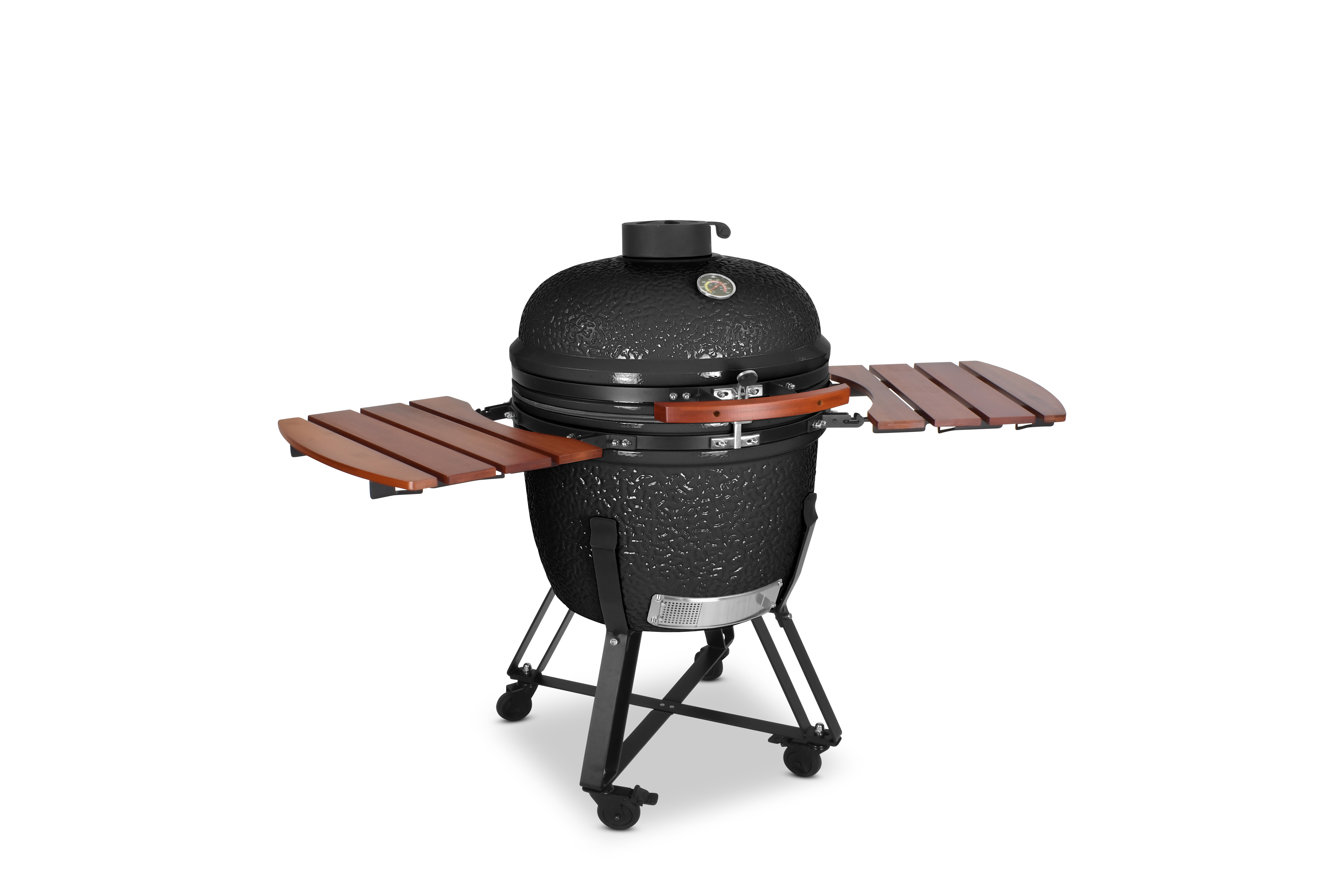 Damit es Ihnen an nichts fehlt, wird der Grill mit einem umfangreichen Zubehörpaket geliefert: Zwei einklappbare Ablagen aus Bambusholz links und rechts neben dem Grilldom bieten genügend Ablagefläche, damit sie immer wissen, wo Grillgut, Besteck oder Getränk ihren Platz finden. Sein Gestell bietet dem Kamado nicht nur einen sicheren Stand und hebt ihn in eine angenehme Arbeitshöhe, sondern ist auch mit vier Schwerlastrollen ausgestattet, um ihn mit wenig Mühe zu bewegen. Damit beim Grillen nichts rollt, besitzen zwei der Räder Feststellbremsen.